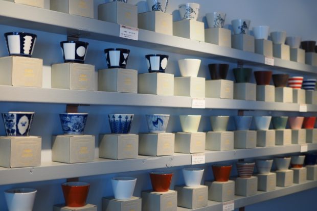 こちらは、同じくマルヒロのブランド「馬場商店」のそば猪口(SOBA CHOKO)シリーズ。若者好みのものからシニア好みのデザインまで壁一面にそば猪口が並ぶ。